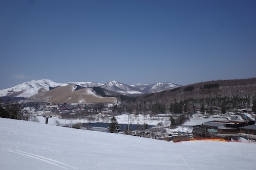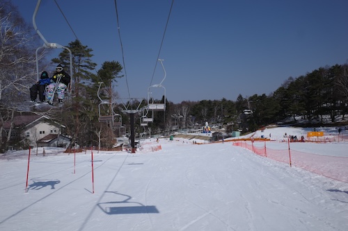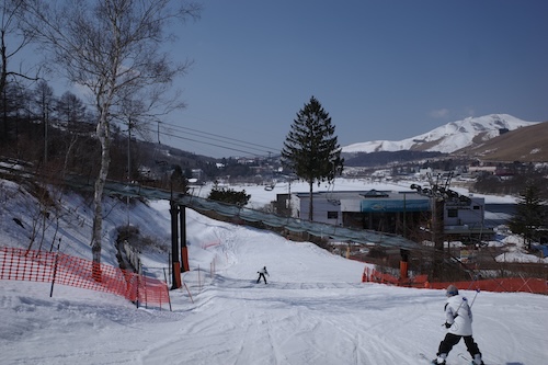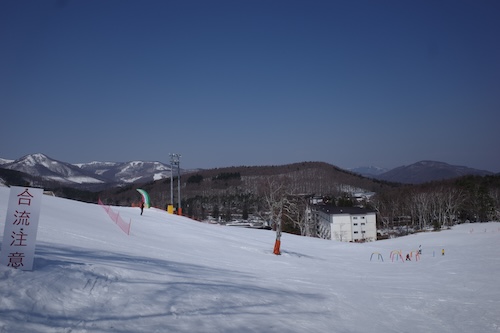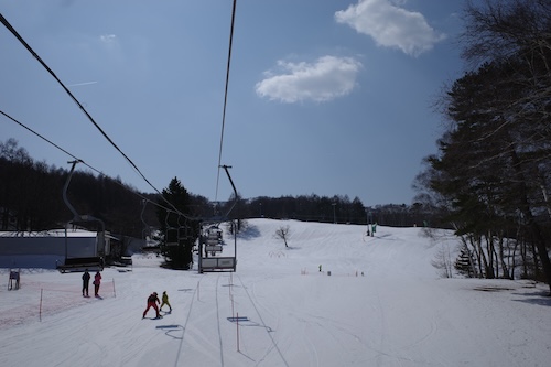 第2リフトから見るゲレンデ。コンパクトですが滑りやすく初心者の練習には最適ですのう。気温は高めでしたがコースが荒れるということもなく滑りやすかったです。