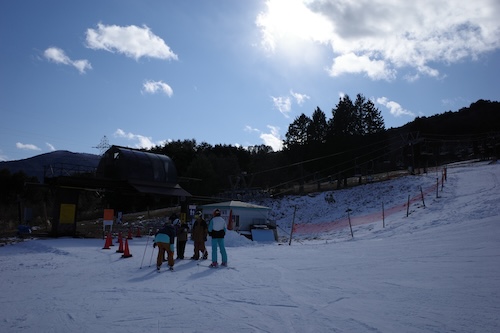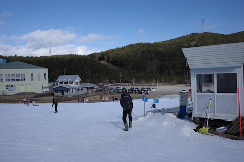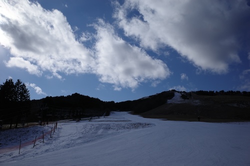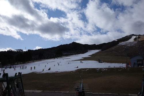 昼寝をしてから準備をしてゲレンデへ。ここへ来るまでの道中で察することができましたが、予想通り全然雪がないですね〜。ちなみにリフト券は回数券を買いました。