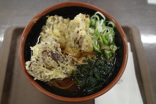 菅平に向けて関越道から上信越道に入り、東部湯の丸SAで休憩。朝食は妙義山麓舞茸天ぷらそば900を食べましたが、舞茸がデカくてまあまあイケますね。お値段的にも納得感ありです。