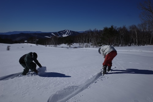 ランチの後は再びファミリーへ。変態カービング軍団おさわり四天王という恥ずかしいネーミングの集団のうち、教授とKさんに会いました。ずいぶんご無沙汰でしたな。シーズン中に一度は遭遇するカオナシさんと、菅平で有名な(だと思っていますが)伊之助さんがいましたよ。