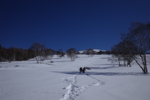 振り返ると板を外して歩いてくるhorihさんとYさん。