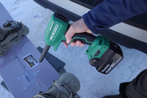駐車場で板に付いた雪をほうきで払っていると、隣の達人の車から何やら聞こえてきます。この音はまさか…見るとエアダスターで板に付いた雪を吹き飛ばしているではありませんか。なんと、これは考えもしませんでしたね。便利そうなのでエス氏も真似してみようかしら。