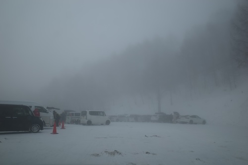 かすみ亭で朝食をとり、ガスって視界の悪い中移動しました。かすみ亭から忍者の駐車場までは10分程度の距離。地図を見ると忍者のコースの上まではかすみ亭からすぐ近くなんですけどね。ちなみに慣れているはずの達人たちの車はエス氏の前を走っていたはずが、視界が悪くて道を間違えたのでしょう、駐車場にはエス氏の後に到着しましたよ。