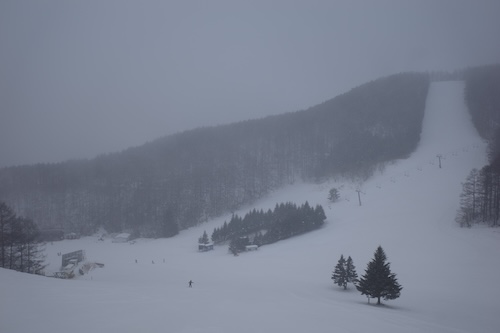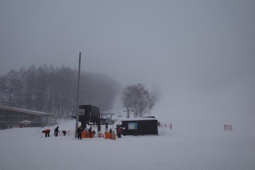 足ならしのドラゴコース。視界は少々悪いものの、雪も良くて滑りやすいコースでしたな。