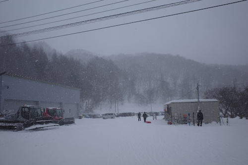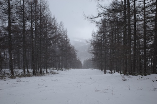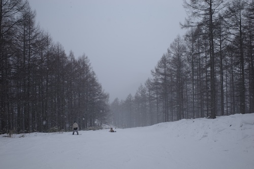 あまり滑りに行かない迂回忍コースへ。コース脇に車道が見えるのですが、かすみ亭はこの辺りの通りを左へ入って行ったところにありますよ。