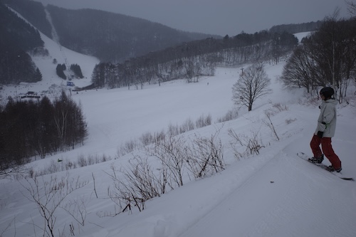 REWILDリフトにも乗ってみましたよ。リワイルドコースはまだ雪が少ないですのう。マツザワ師は「どんなもんだか試しに滑ってみるか」って感じの発言をするのですが、多分ギャグじゃないんですよね…滑るわけねえだろこんな雪も少ないガタガタの急斜面。しかもアルペンボードで。