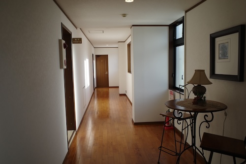 建物の前に車を駐めて館内へ。荷物は自分で運びますよ。エントランスで靴を脱ぎます。ロビーは開放感がありましたね。
