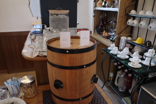 エントランスの脇にはドリンクコーナーがあります。コーヒーなども飲めますが、ワインが飲み放題なのが素晴らしいですな。しかもまあまあ美味いんですわ、これが。
