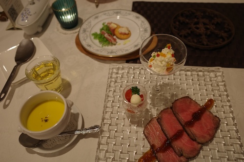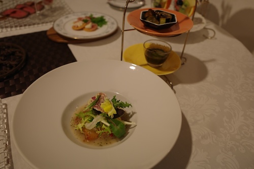 夕食の時間になったのでダイニングルームへ。以下料理の写真です。