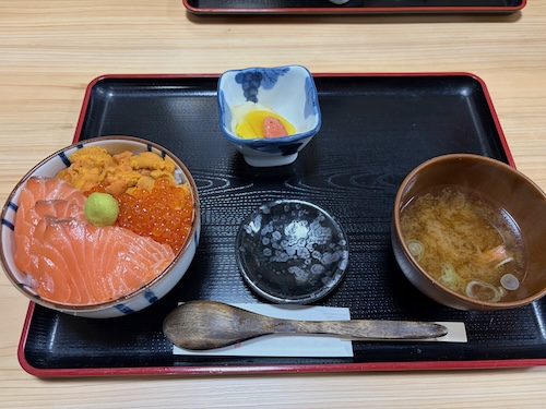 ランチは近くの店で海鮮を食べることに。ウニいくらサーモン丼4,200円をいただきましたが、ウニよりいくらより、サーモンの美味さが衝撃的でしたね。美味すぎる…。