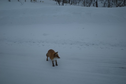 オロフレスキー場を出てサンライバスキー場までは約40分ほどの移動でした。オロフレ峠の路面は雪でしたが、レンタルしたハリアーは安定した走りをしてくれましたのう。前方から動物が歩いてくるのが見えたので車を止めると狐でした。