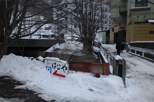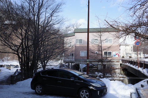 はなやは地獄谷からは少し離れた立地となります。地獄谷に向かうクスリサンベツ川沿いの通りの左側に建物が見えますが、駐車場はその少し先を左に入ったところにありますよ。少しわかりにくいです。