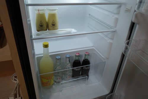 冷蔵庫の中にあるドリンクやプリンは全て無料。ゆずのお酒もありましたけどこれも無料でした。お酒もプリンもなかなか美味しかったですよ。